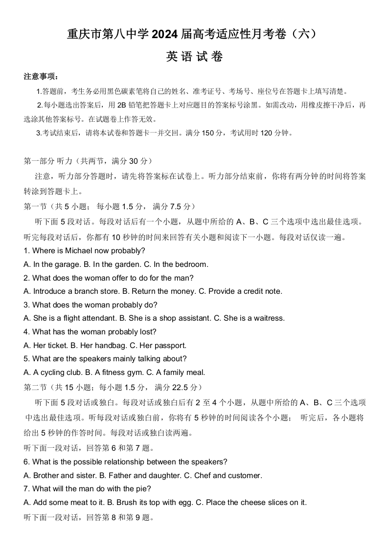 重庆市第八中学2024届高考适应性月考卷(六)英语