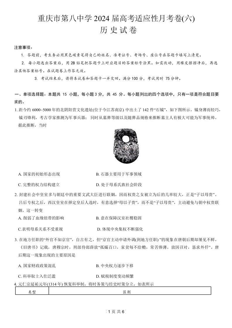 重庆市第八中学2024届高考适应性月考卷(六)历史