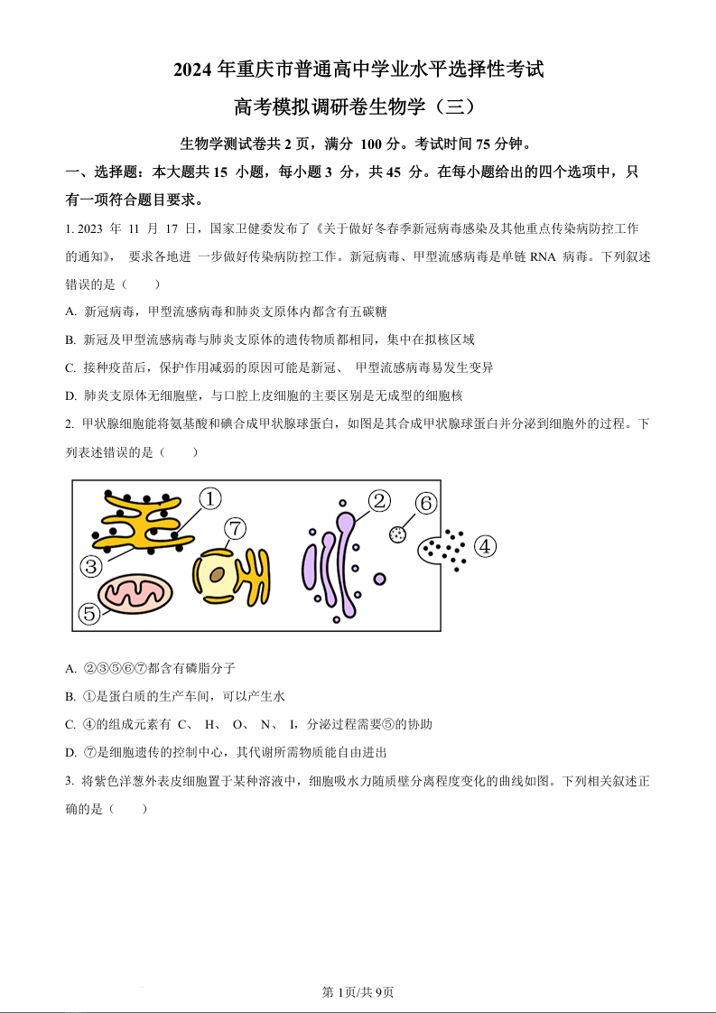 康德2024届重庆市普通高等学校招生全国统一考试高考模拟调研卷(三)生物(原卷版)