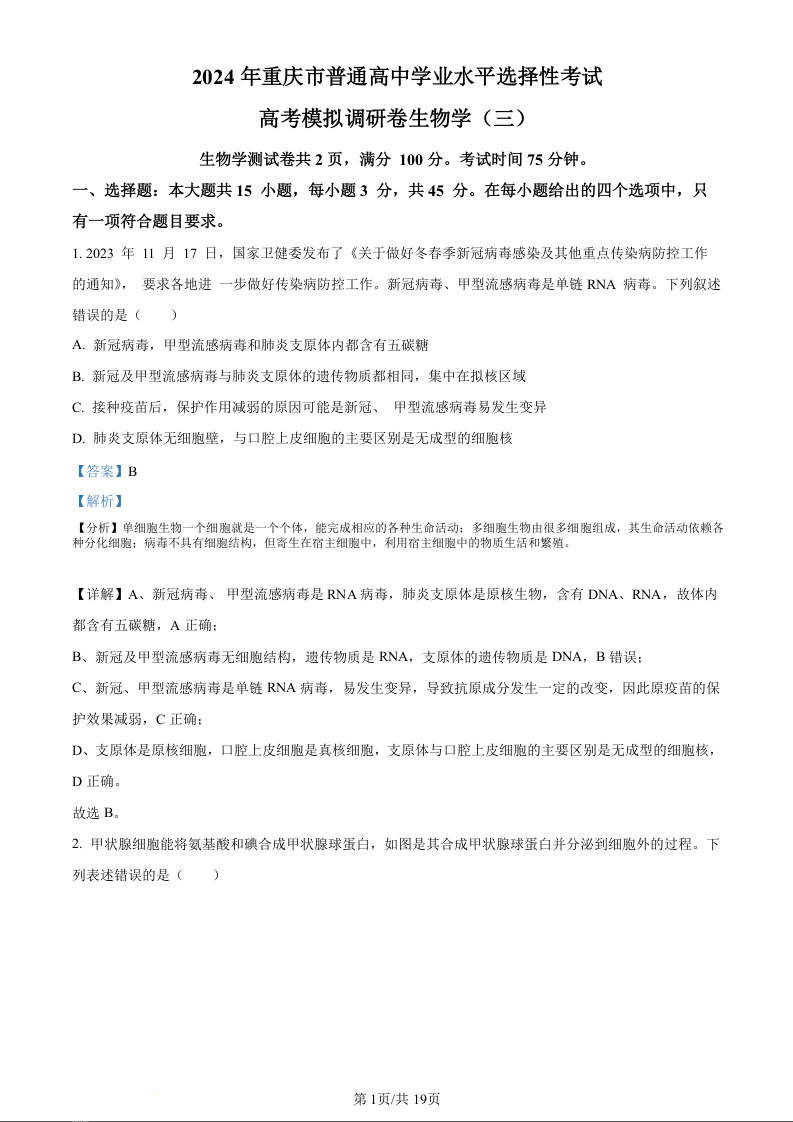 康德2024届重庆市普通高等学校招生全国统一考试高考模拟调研卷(三)生物(精品解析版)
