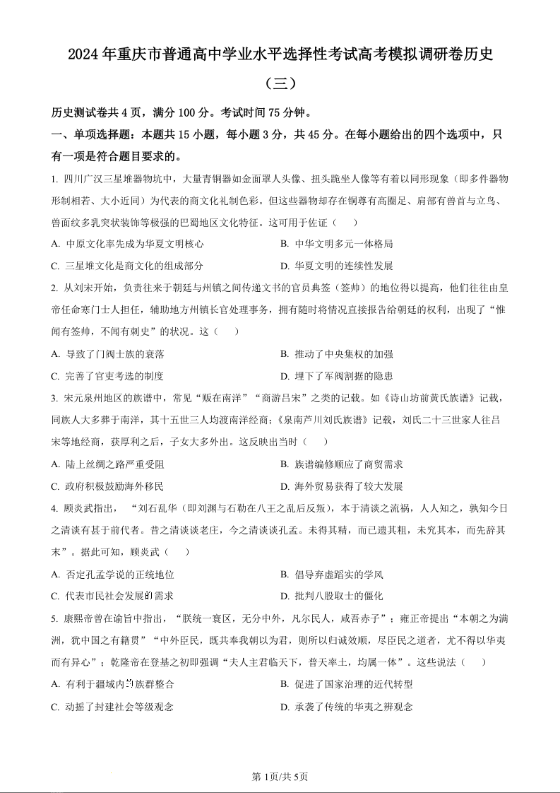 康德2024届重庆市普通高等学校招生全国统一考试高考模拟调研卷(三)历史(原卷版)