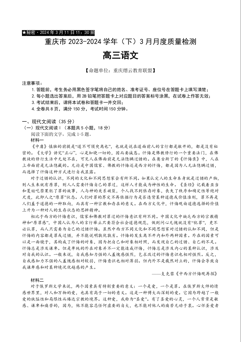 重庆市缙云教育联盟2024届高三下学期3月月考语文+答案