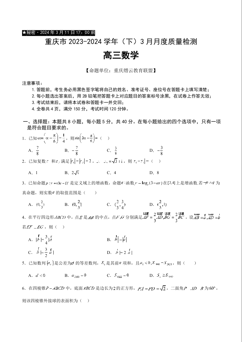 重庆市缙云教育联盟2024届高三下学期3月月考数学+答案