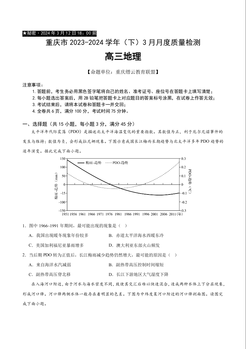 重庆市缙云教育联盟2024届高三下学期3月月考地理+答案