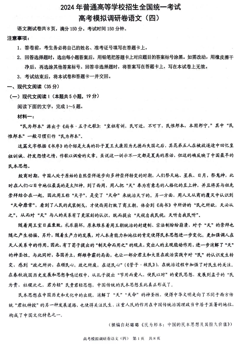重庆市康德卷2024年普通高等学校招生全国统一考试高考模拟调研卷(四)语文