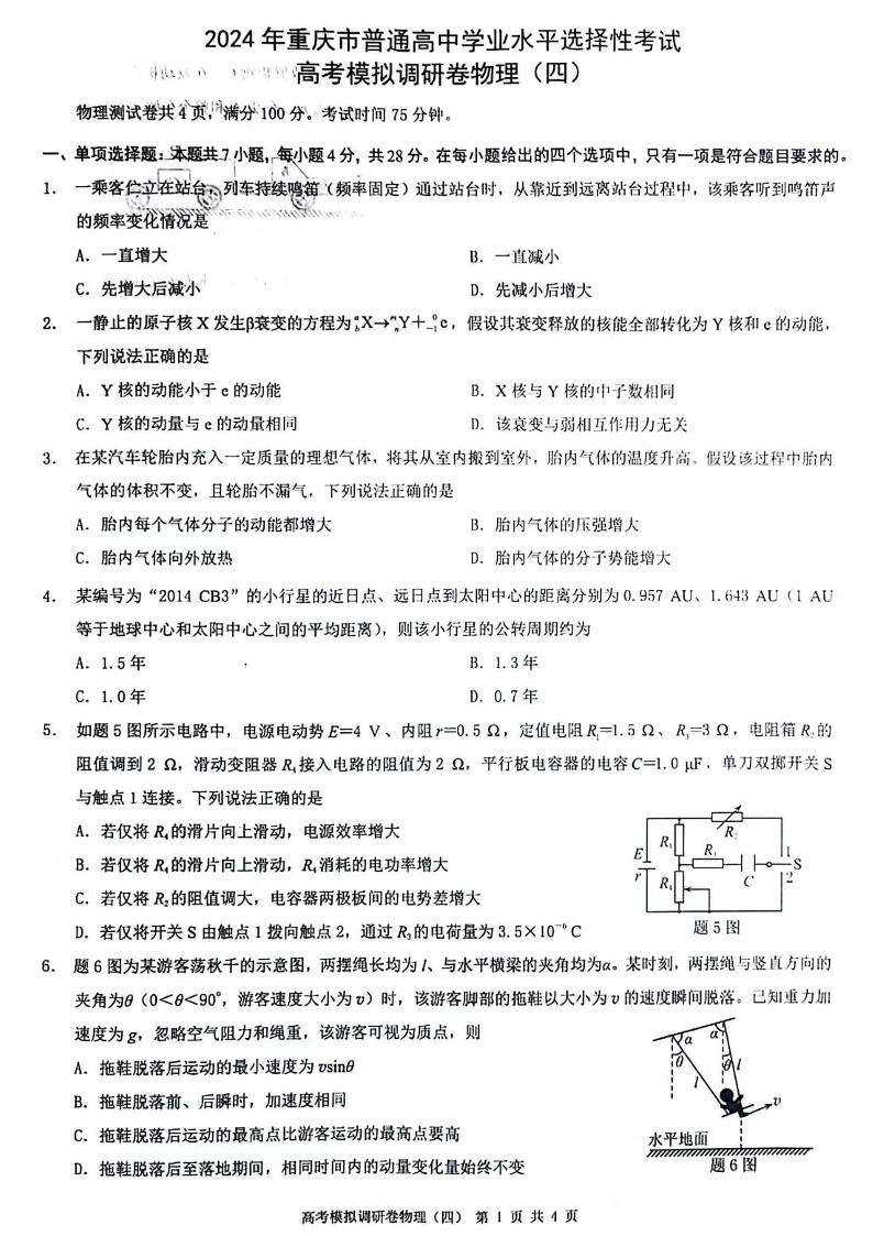 重庆市康德卷2024年普通高等学校招生全国统一考试高考模拟调研卷(四)物理