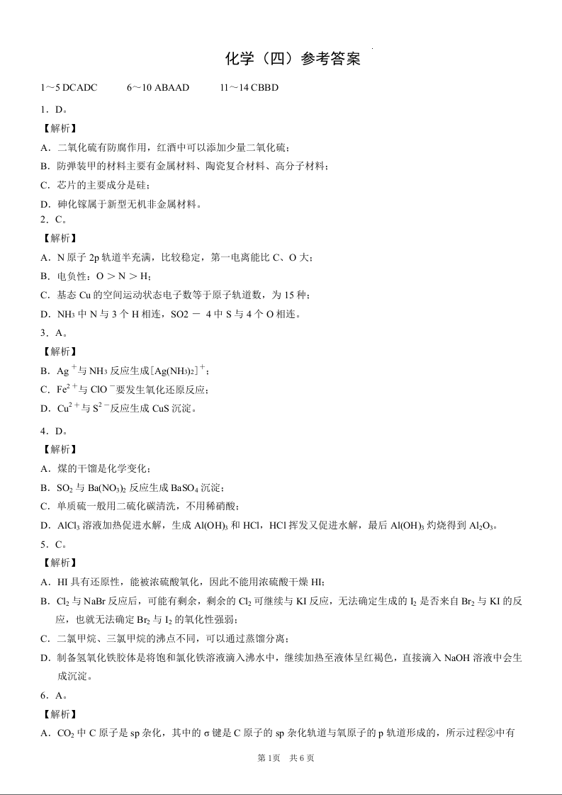 重庆市康德卷2024年普通高等学校招生全国统一考试高考模拟调研卷(四)化学答案