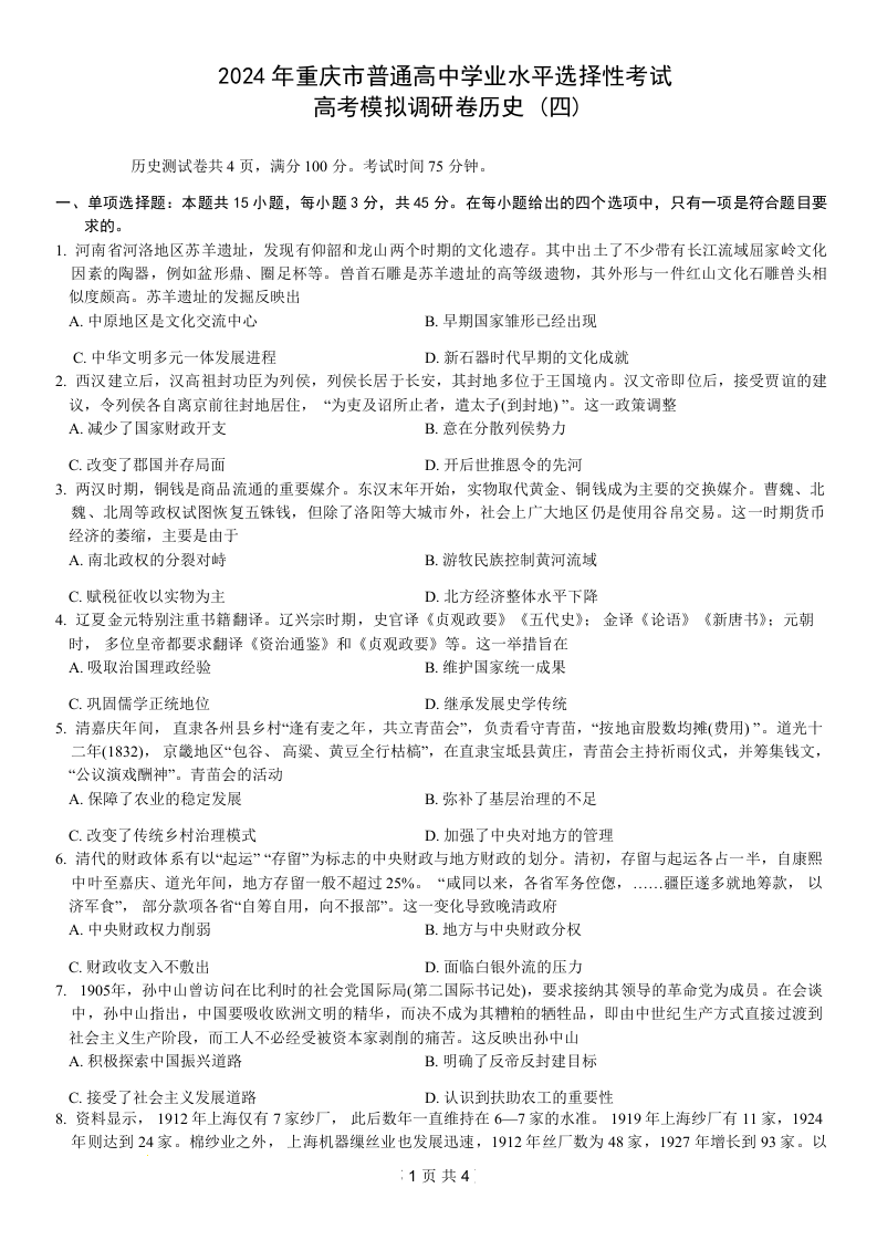 重庆市康德卷2024年普通高等学校招生全国统一考试高考模拟调研卷(四)历史