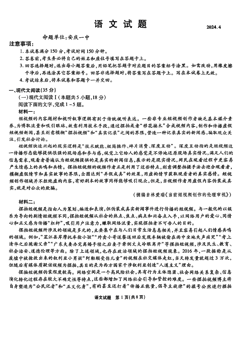 安徽省2024届安庆示范高中高三下学期4月联考(三模)语文+答案