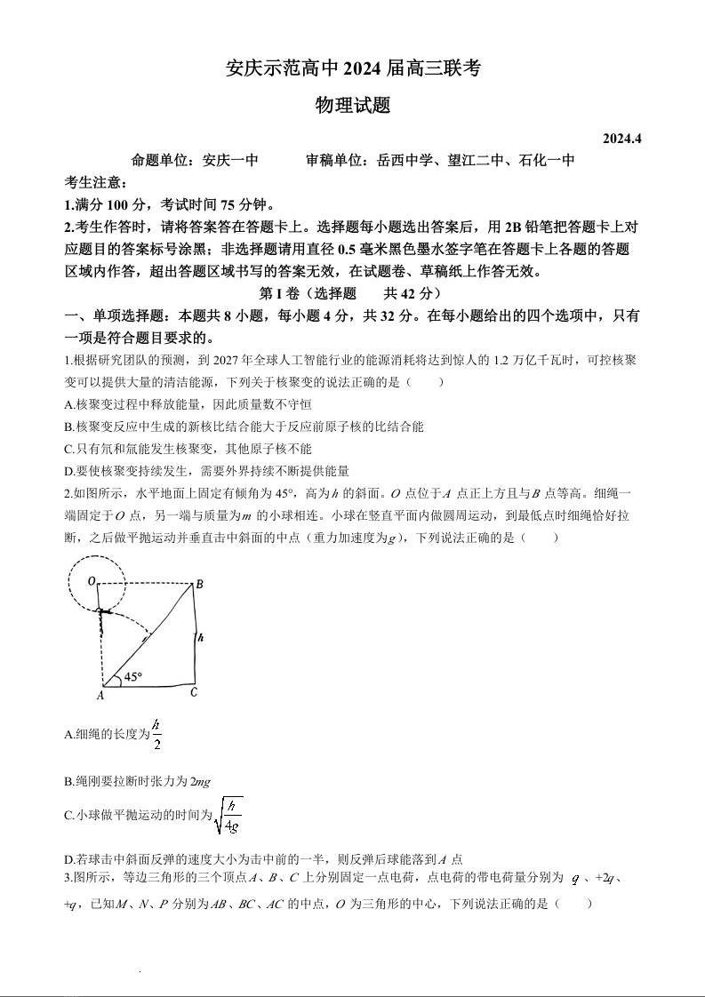 安徽省2024届安庆示范高中高三下学期4月联考(三模)物理+答案