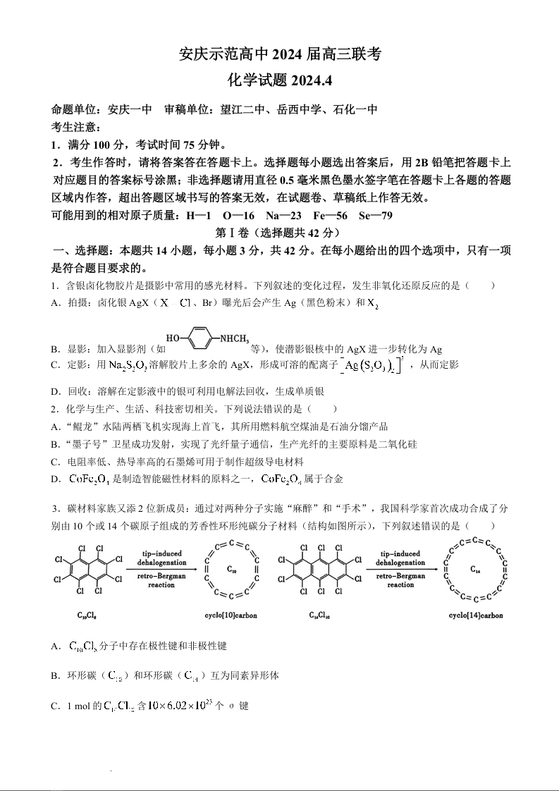 安徽省2024届安庆示范高中高三下学期4月联考(三模)化学+答案