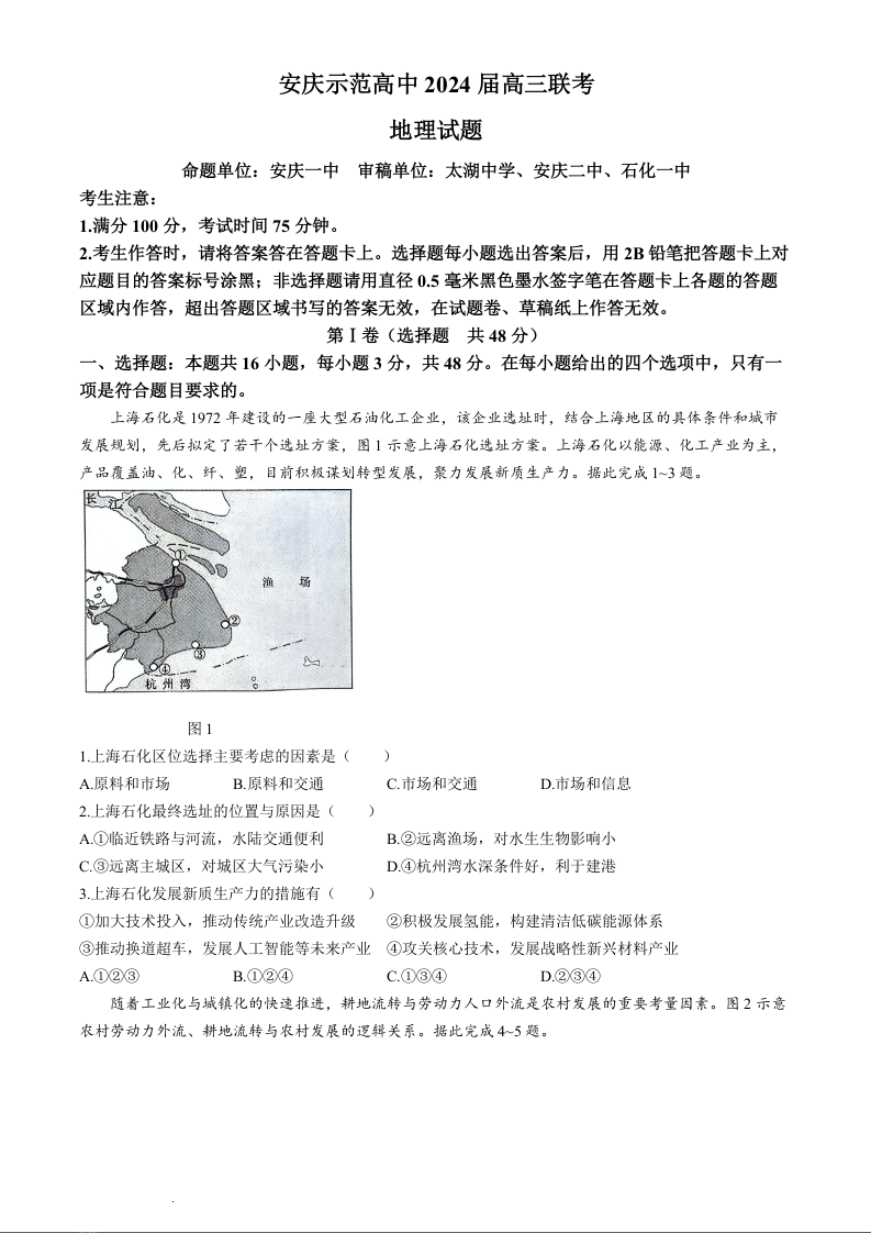 安徽省2024届安庆示范高中高三下学期4月联考(三模)地理+答案