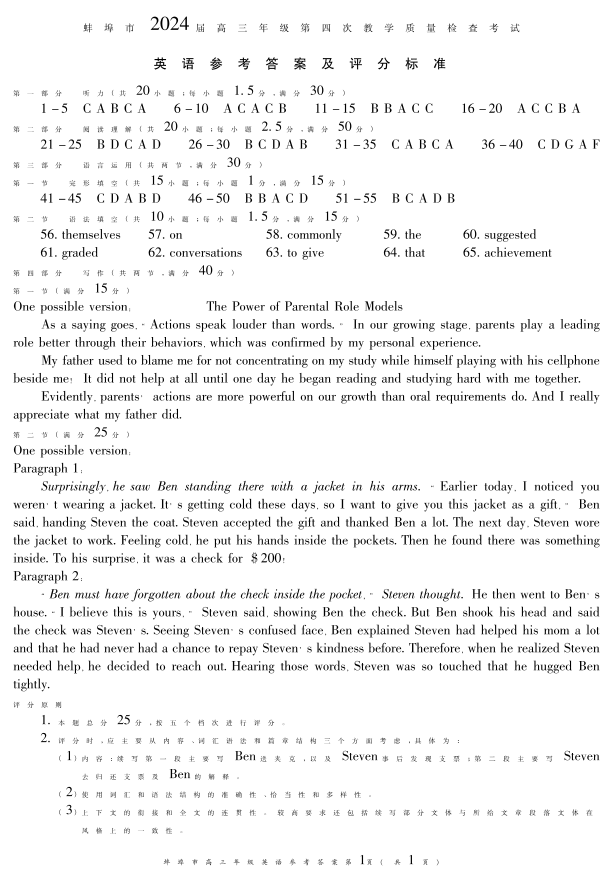 安徽省蚌埠市2024届高三下学期第四次教学质量检测考试(蚌埠四模滁州二模)英语答案