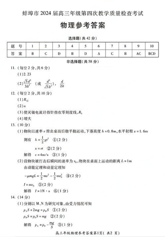 安徽省蚌埠市2024届高三下学期第四次教学质量检测考试(蚌埠四模滁州二模)物理答案