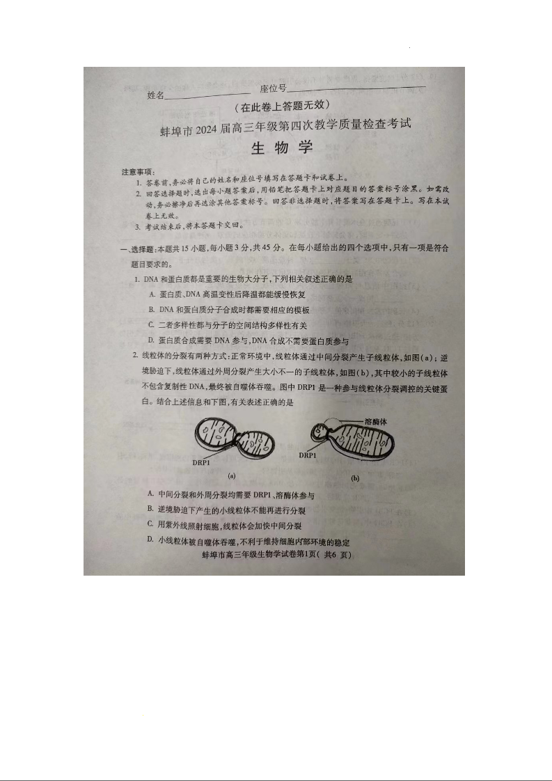 安徽省蚌埠市2024届高三下学期第四次教学质量检测考试(蚌埠四模滁州二模)生物