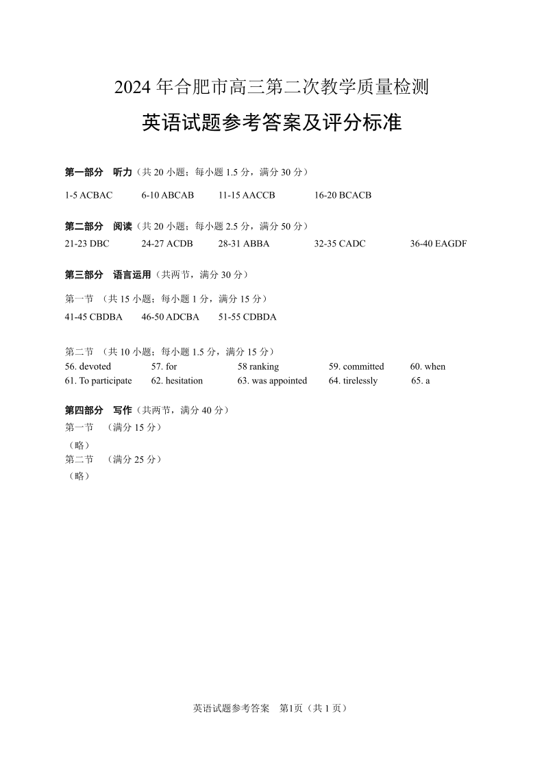 安徽省合肥市2024届高三第二次教学质量检测(合肥二模)英语答案