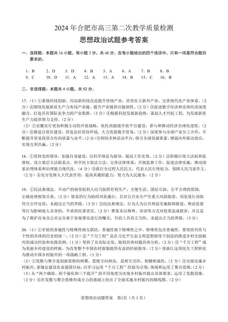 安徽省合肥市2024届高三第二次教学质量检测(合肥二模)政治答案