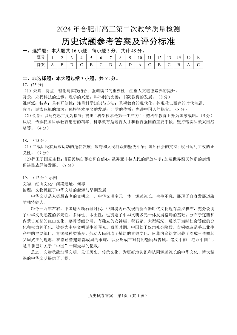 安徽省合肥市2024届高三第二次教学质量检测(合肥二模)历史答案