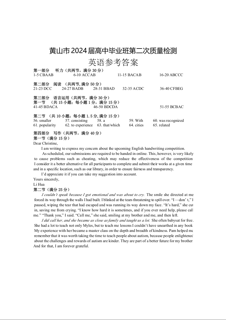 安徽省黄山市、宣城市2024届高三下学期第二次质量检测试题(黄山宣城二模)英语答案