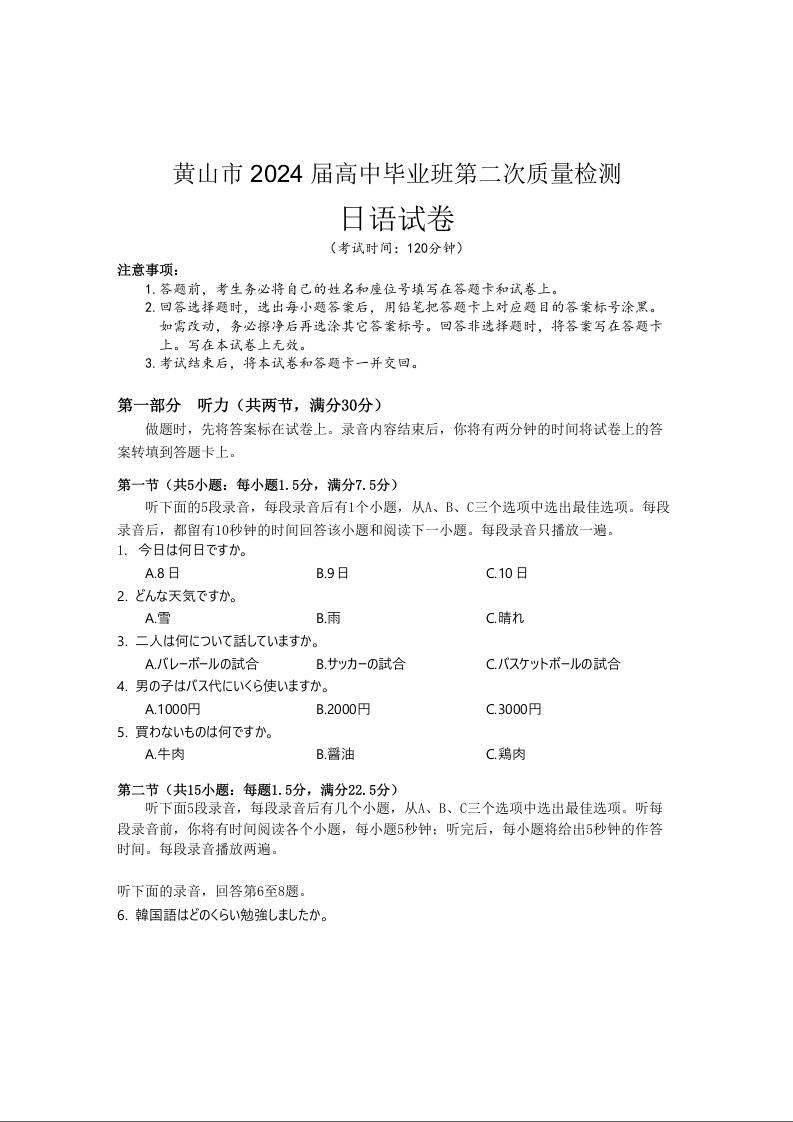 安徽省黄山市、宣城市2024届高三下学期第二次质量检测试题(黄山宣城二模)日语