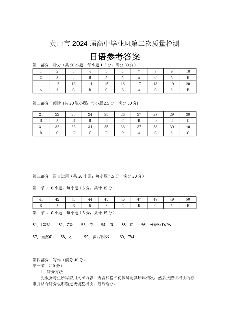 安徽省黄山市、宣城市2024届高三下学期第二次质量检测试题(黄山宣城二模)日语答案