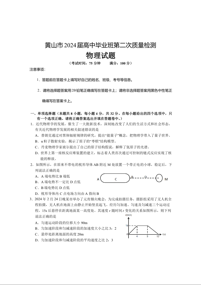 安徽省黄山市、宣城市2024届高三下学期第二次质量检测试题(黄山宣城二模)物理