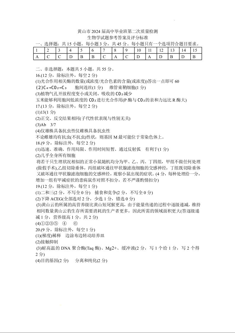 安徽省黄山市、宣城市2024届高三下学期第二次质量检测试题(黄山宣城二模)生物答案