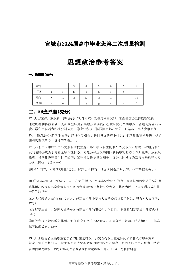 安徽省黄山市、宣城市2024届高三下学期第二次质量检测试题(黄山宣城二模)政治答案