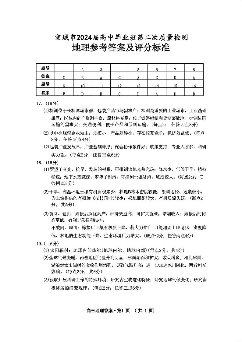 安徽省黄山市、宣城市2024届高三下学期第二次质量检测试题(黄山宣城二模)地理答案