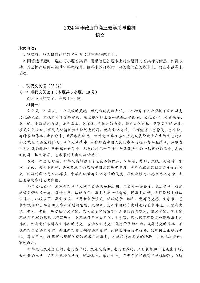 安徽省马鞍山市2024届高三下学期三模语文+答案