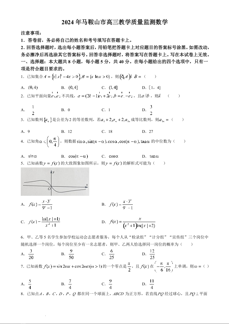 安徽省马鞍山市2024届高三下学期三模数学