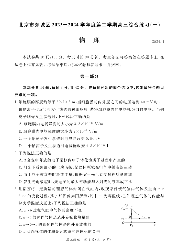 北京市东城区2024届度第二学期高三综合练习(一)物理+答案