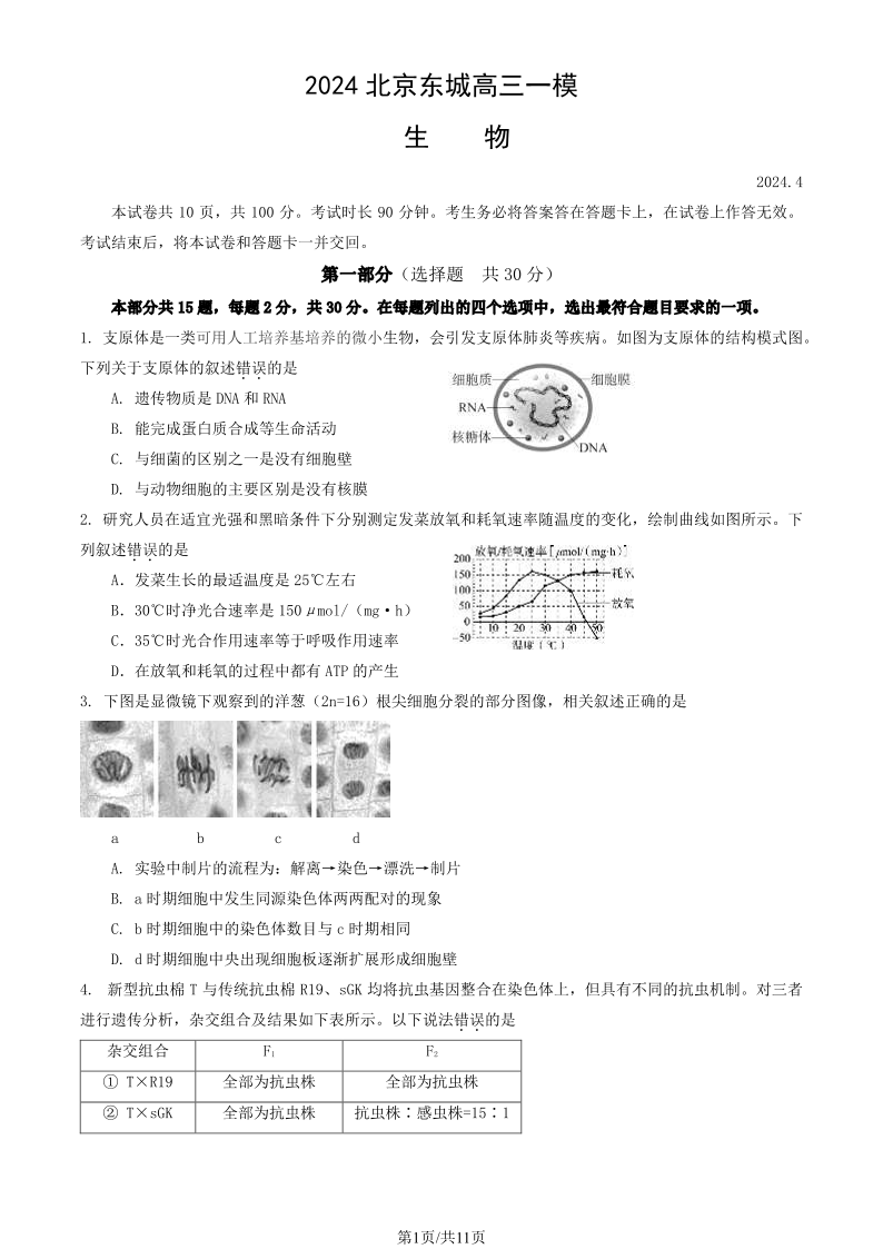 北京市东城区2024届度第二学期高三综合练习(一)生物+答案