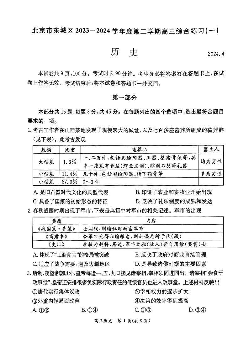 北京市东城区2024届度第二学期高三综合练习(一)历史+答案