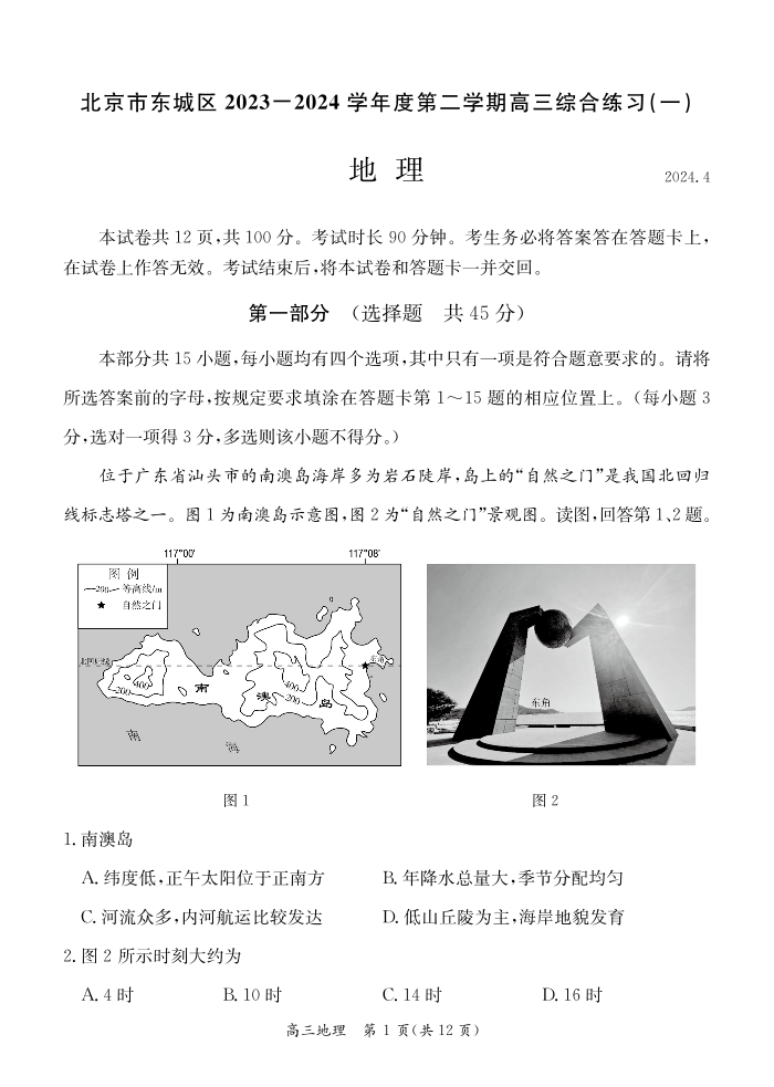 北京市东城区2024届度第二学期高三综合练习(一)地理