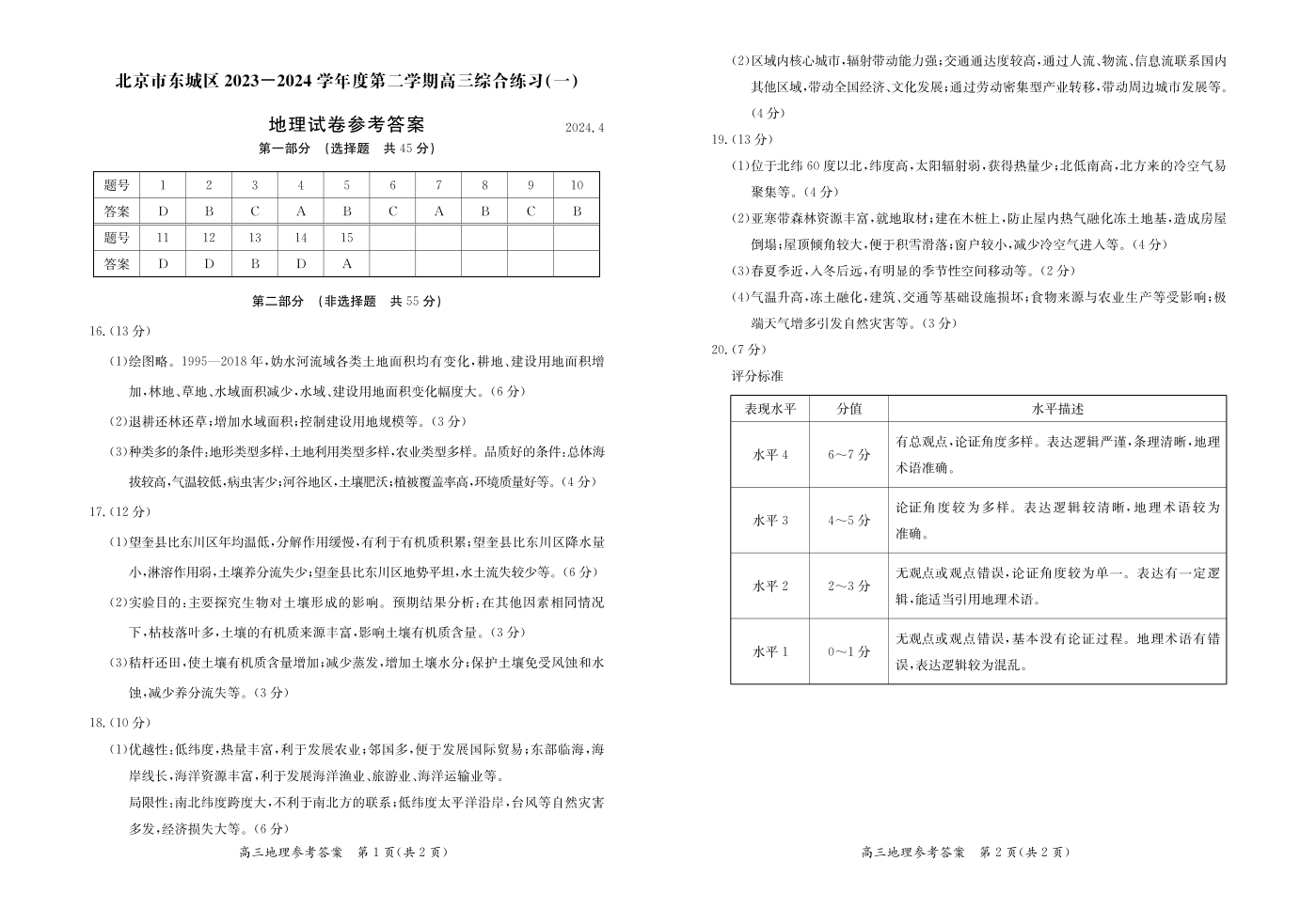 北京市东城区2024届度第二学期高三综合练习(一)地理答案