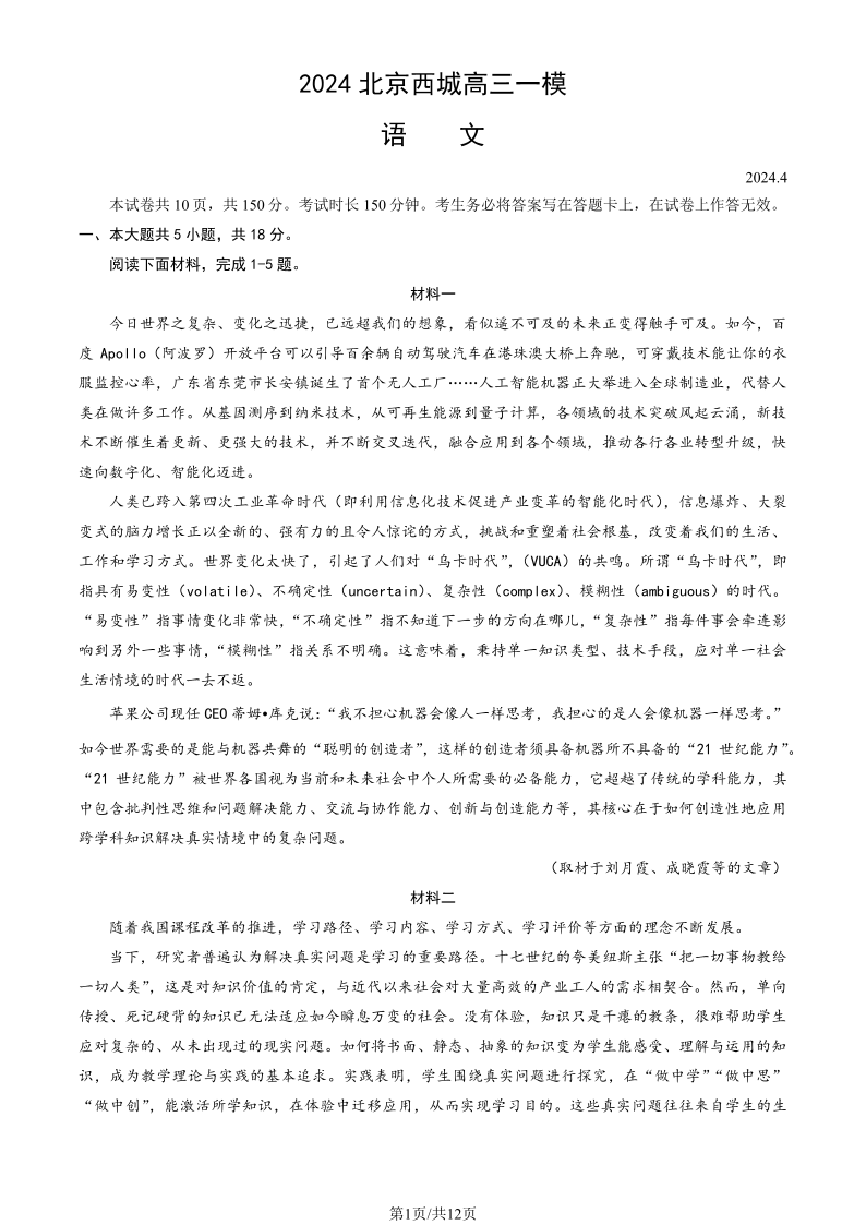 北京市东城区2024届高三一模语文+答案