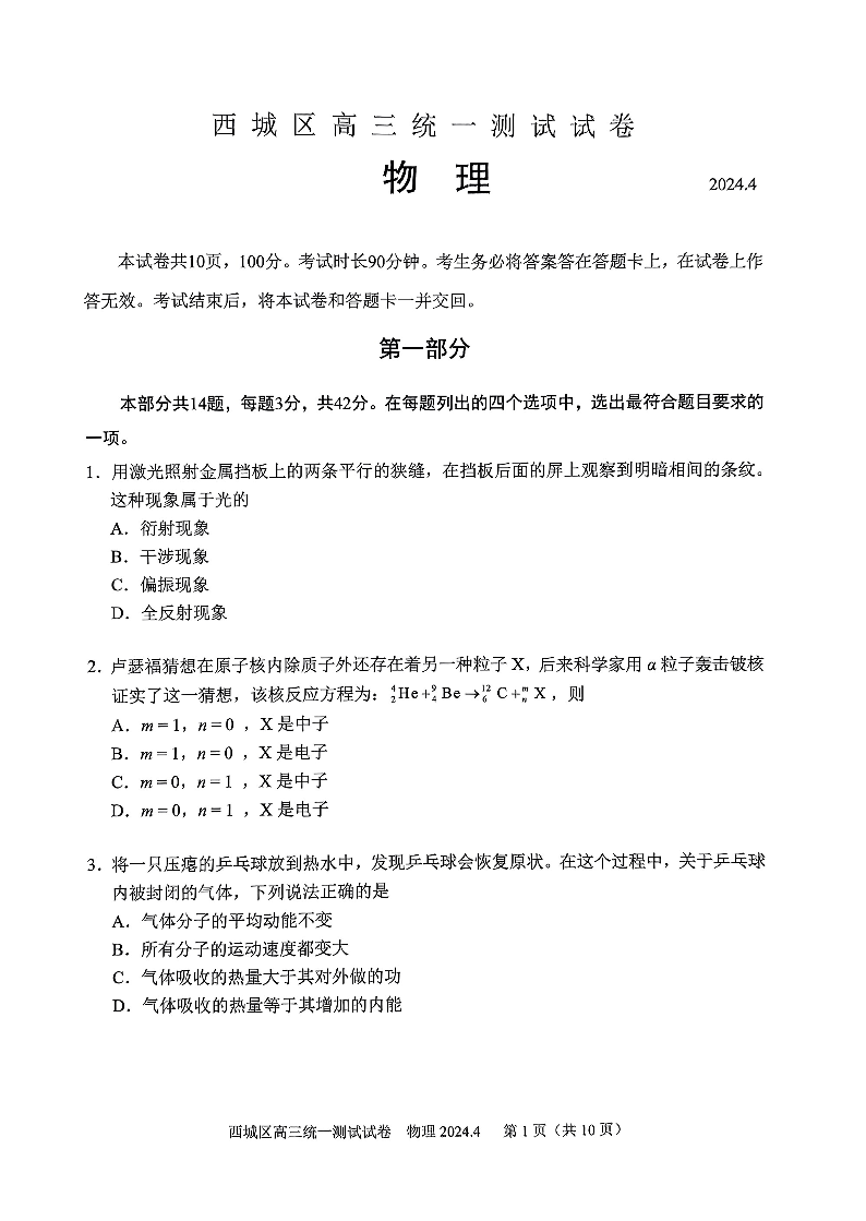北京市东城区2024届高三一模物理+答案
