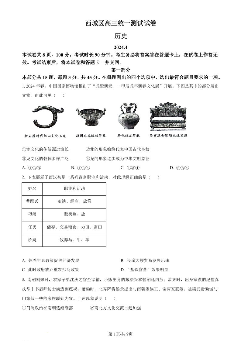 北京市东城区2024届高三一模历史 (原卷版)