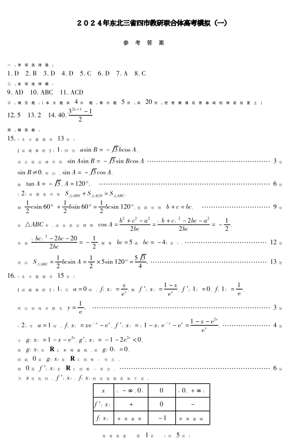 东北三省四市2024届教研联合体高考模拟(一)数学答案