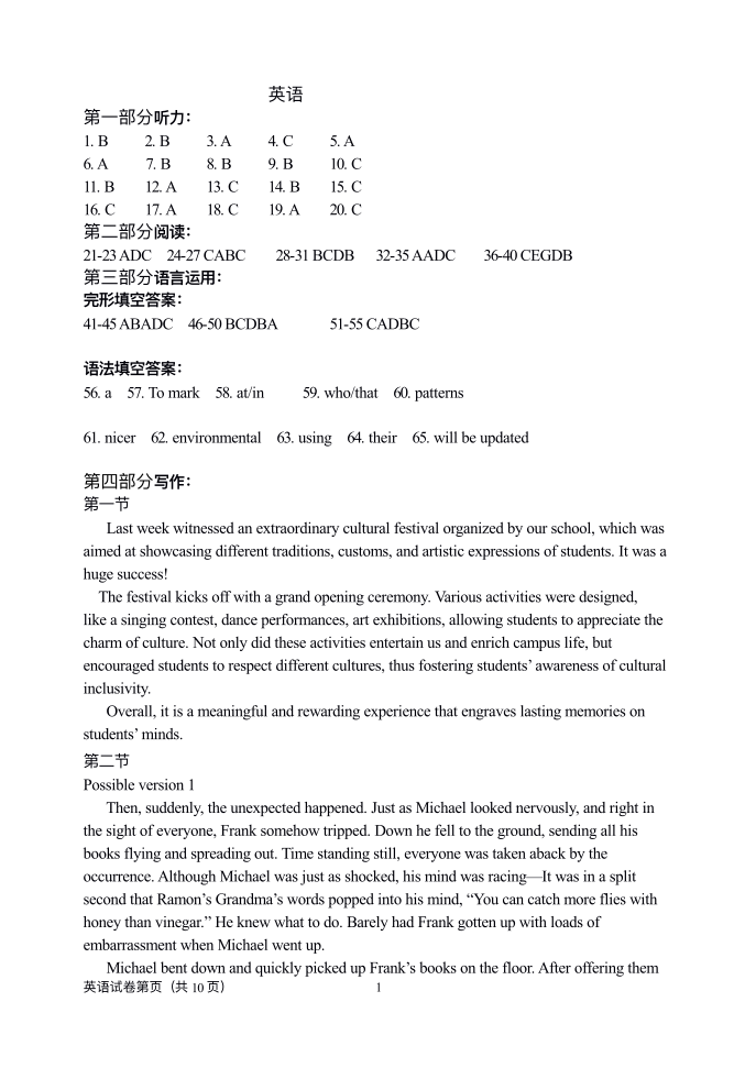 东北三省四市2024届教研联合体高考模拟(一)英语答案