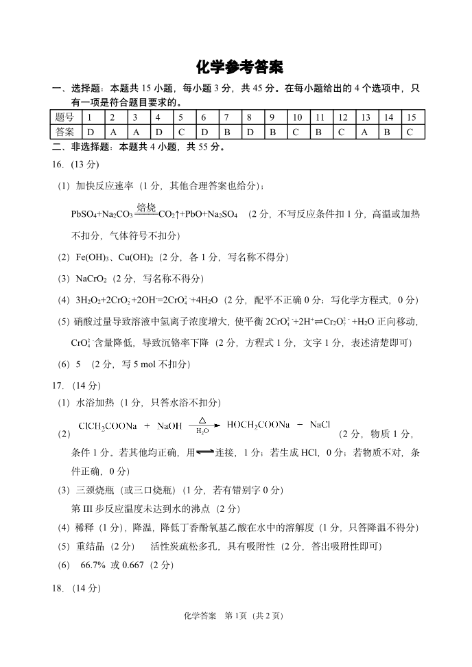 东北三省四市2024届教研联合体高考模拟(一)化学答案