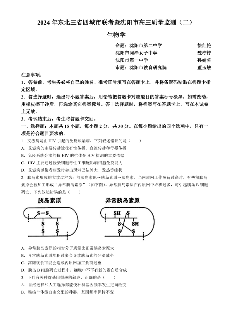 东北三省四市2024届教研联合体高考模拟(一)生物+答案