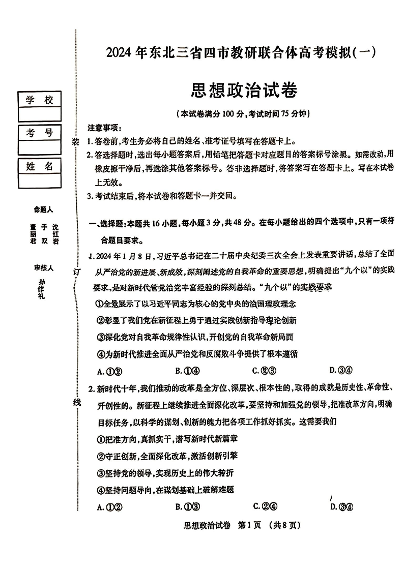 东北三省四市2024届教研联合体高考模拟(一)政治