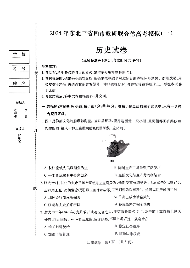 东北三省四市2024届教研联合体高考模拟(一)历史