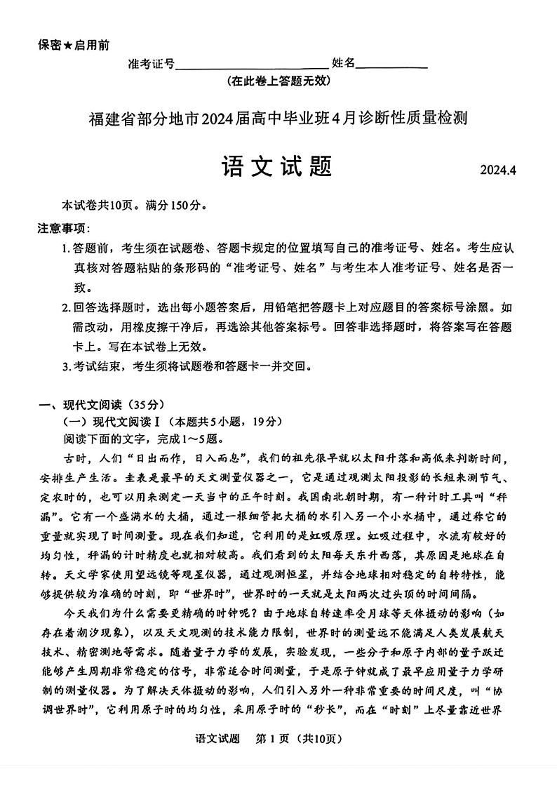 福建省部分地市2024届高中毕业班4月诊断性质量检测语文
