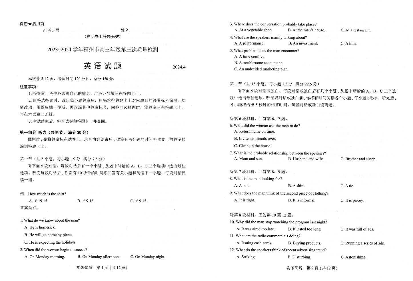 福建省部分地市2024届高中毕业班4月诊断性质量检测英语
