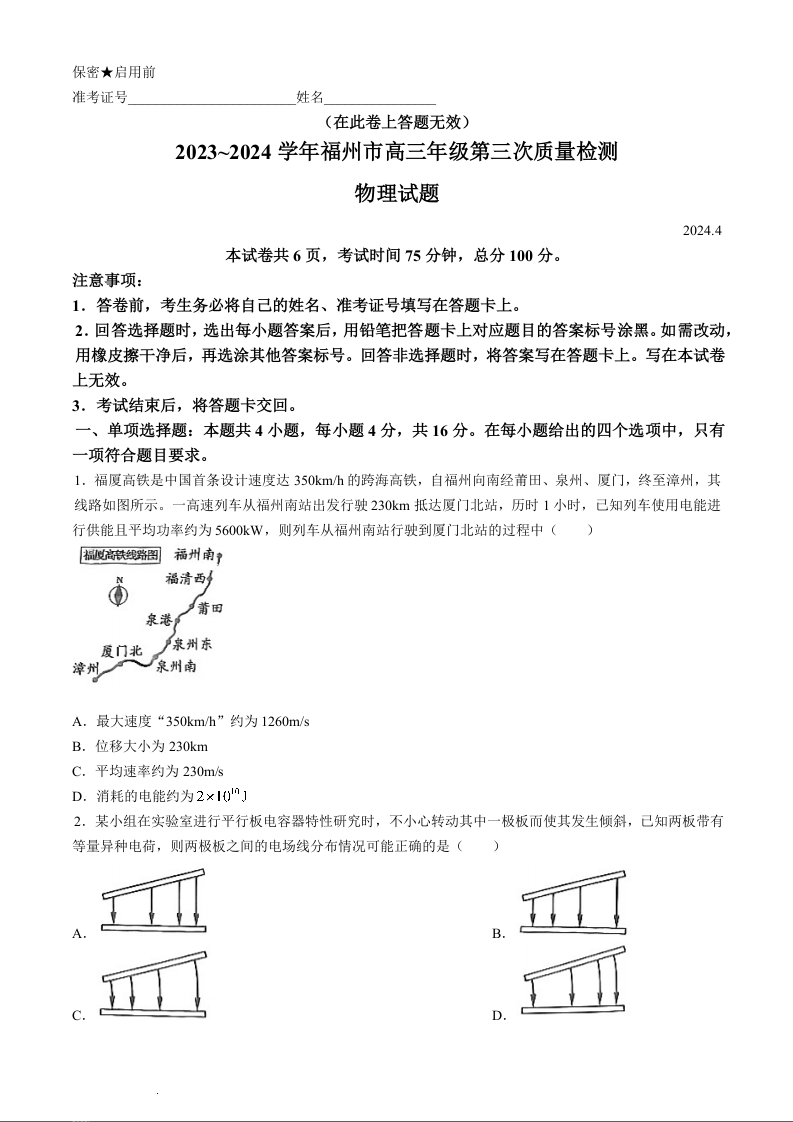 福建省部分地市2024届高中毕业班4月诊断性质量检测物理+答案