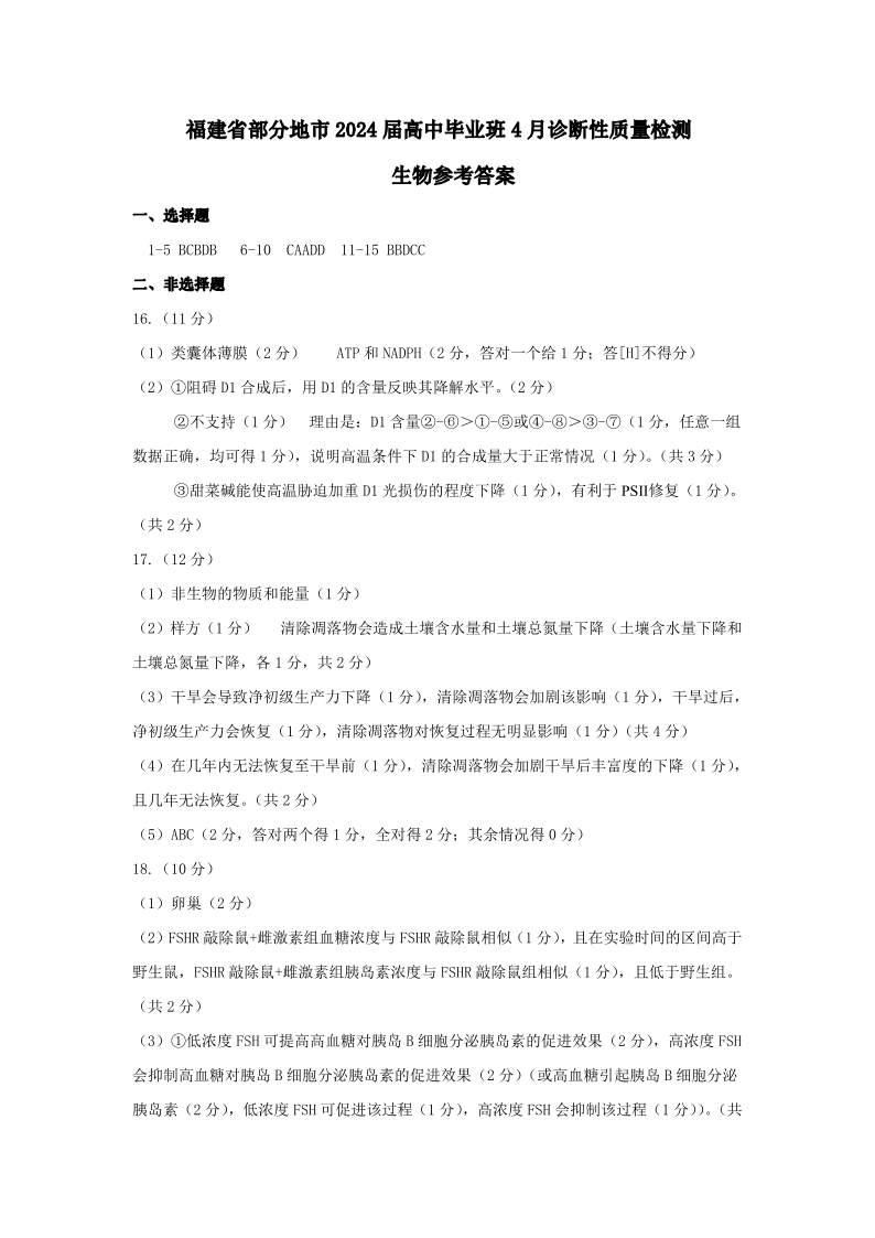 福建省部分地市2024届高中毕业班4月诊断性质量检测生物答案