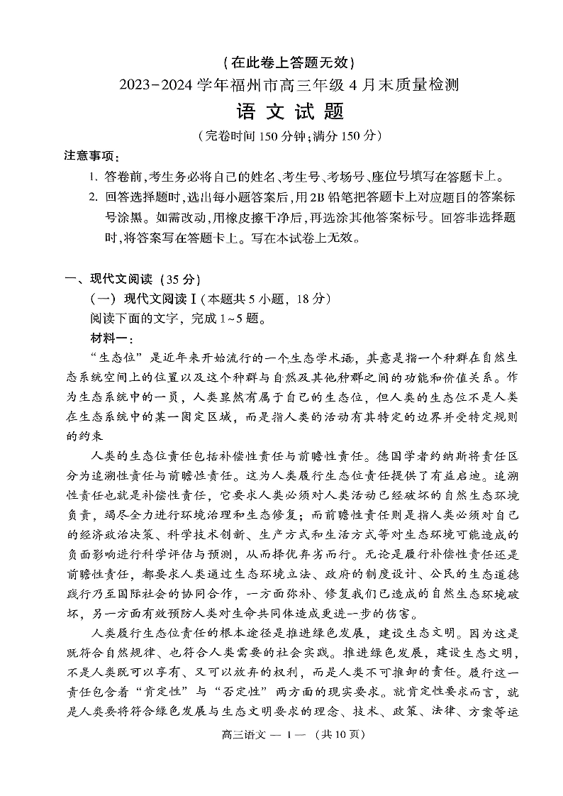 福建省福州市2024届高三下学期4月末质量检测(三模)语文